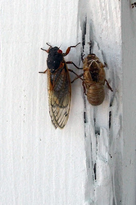 No, this is not a "pretty" picture. In fact, if you are not a fan of bugs, it's pretty icky. This represents a big part of daily life right now for a lot of us in the eastern United States. Brood X cicadas are swarming in their seventeen-year festival, trying to find a mate and reproduce. First, we noticed holes in the ground under certain trees. Then one warm morning, dozens appeared in our front garden. Now there are millions just in our neighborhood. This guy emerged from the exoskeleton to his right. He was testing his legs, waiting for his body and wings to harden. The old shell had eyes and legs. It's a remarkable transformation. But mostly right now, it's just very, very noisy around here!