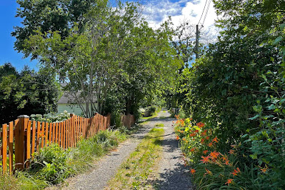 A system of alleys starts and stops, offering a quiet place to walk on a summer day. The alleys offer a quieter place to mosey along, with a peek into back yard gardens. Flowers spill over fences and birds chirp on low branches. When the sun is out and the daylilies are in bloom, I can almost trick myself into believing that I am on a country lane.